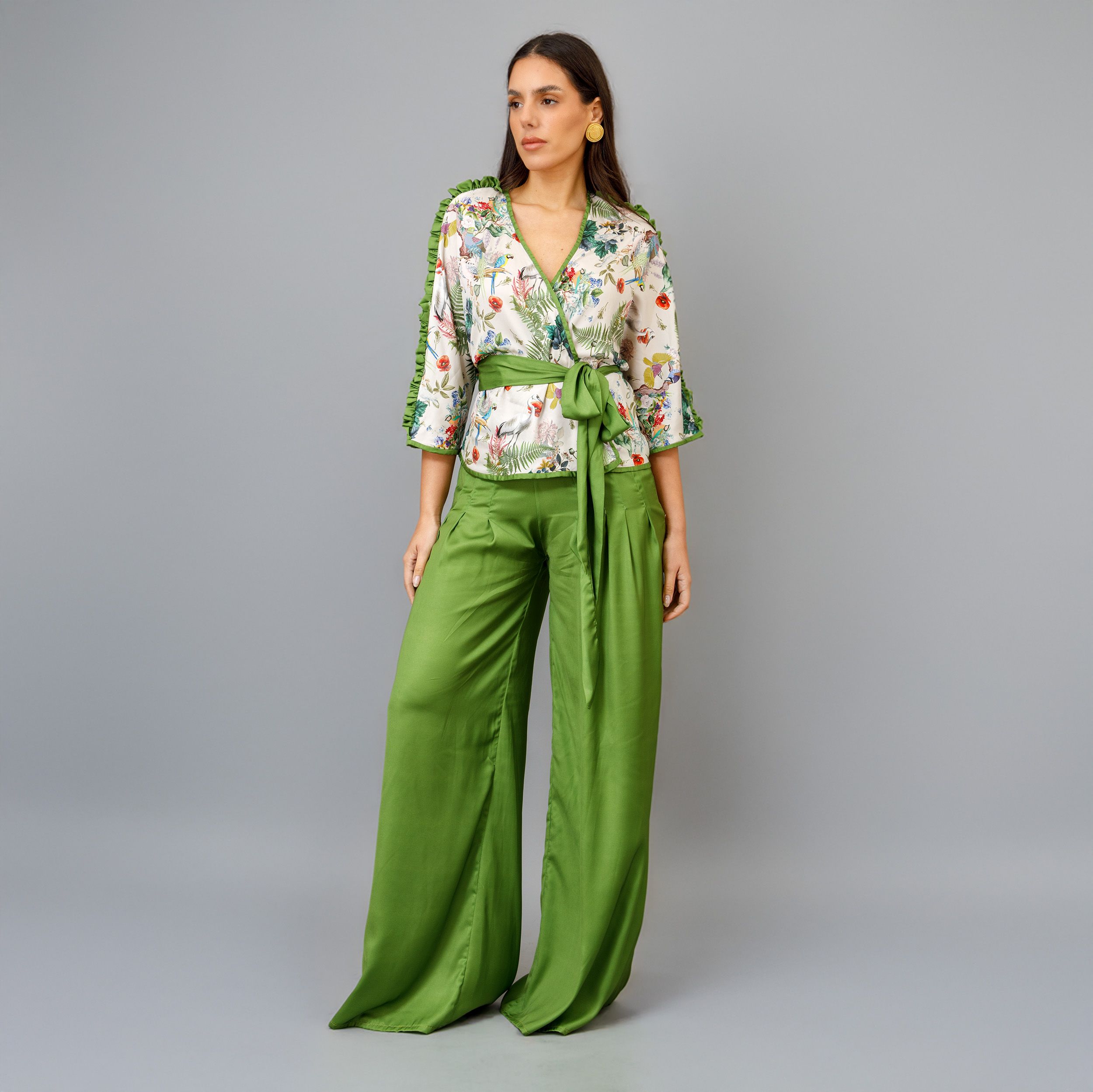 It pairs perfectly with solid mint green wide-leg pants, creating a chic and sophisticated ensemble suitable for various occasions. The combination of the airy top and the relaxed fit of the pants not only emphasizes comfort but also exudes elegance, making it an ideal choice for summer outings or casual gatherings.