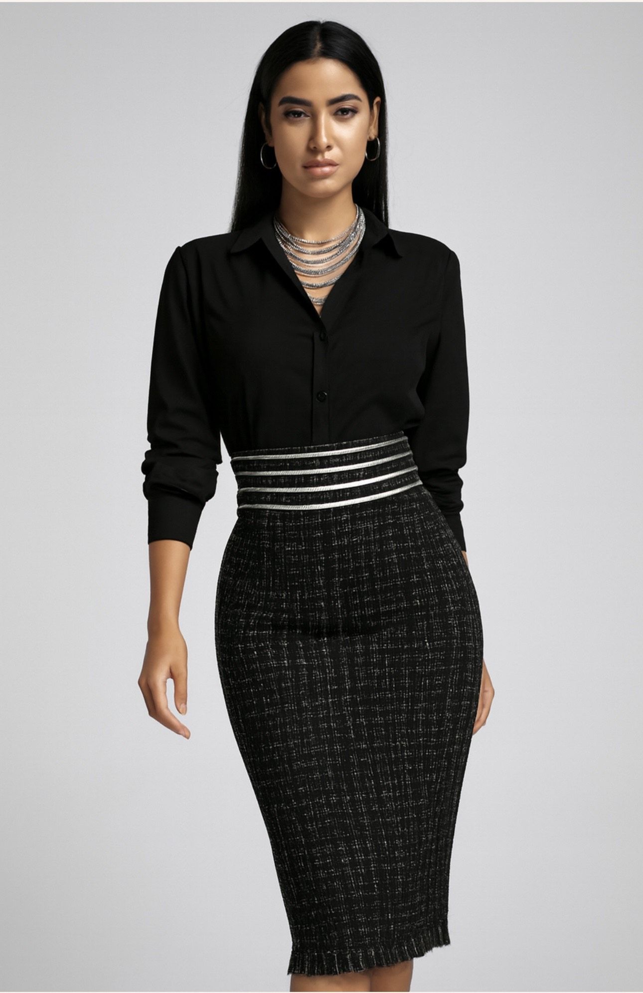 Perfect for profetional settings or upscale social occasions, it pairs effortlessly with crisp shirts or statement blouses. Style it with bold silver accessories for a confident, contemporary look.