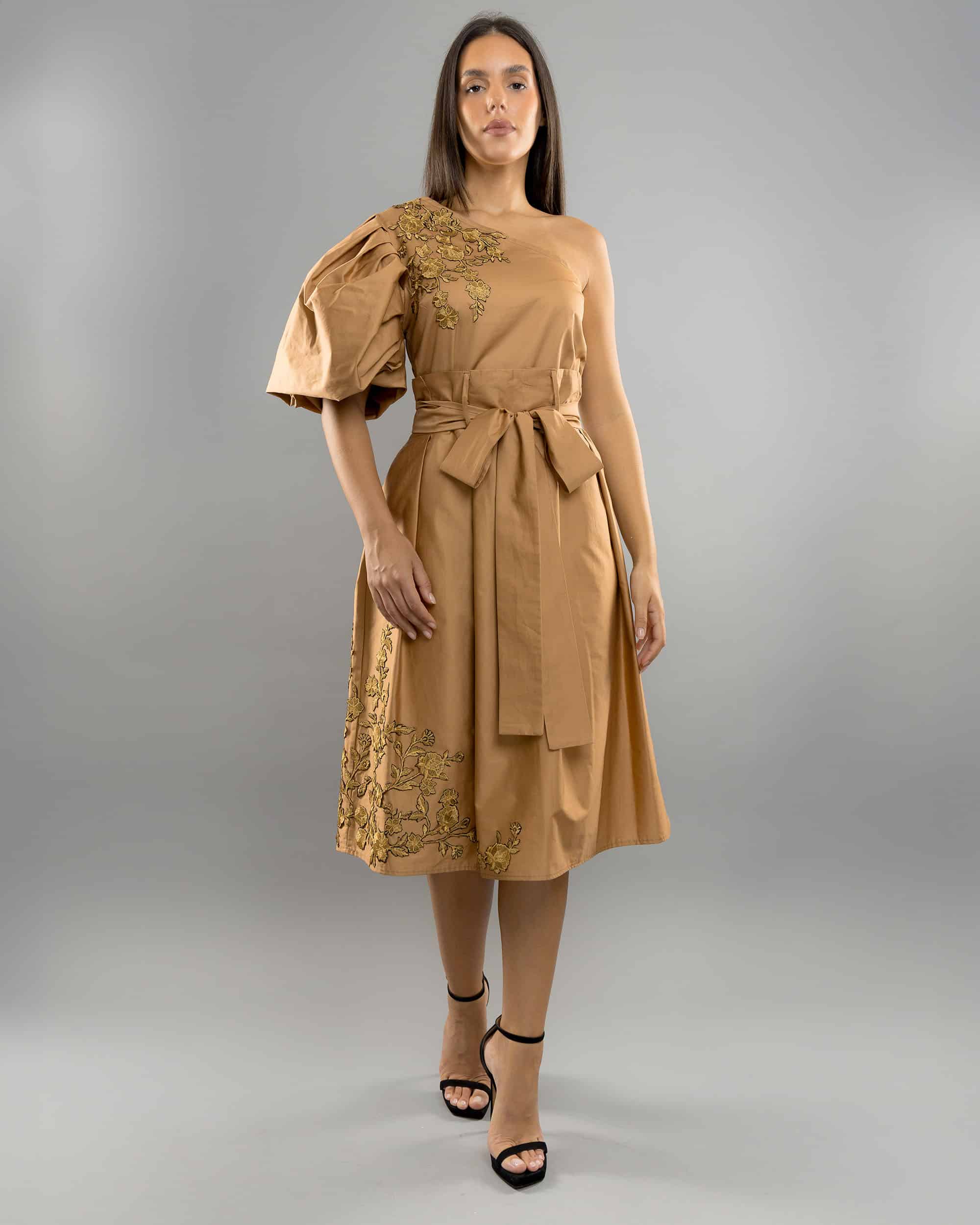 Camel brown Wide skirt with large pleats adorned with beutiful lace that that enhances the outfit.