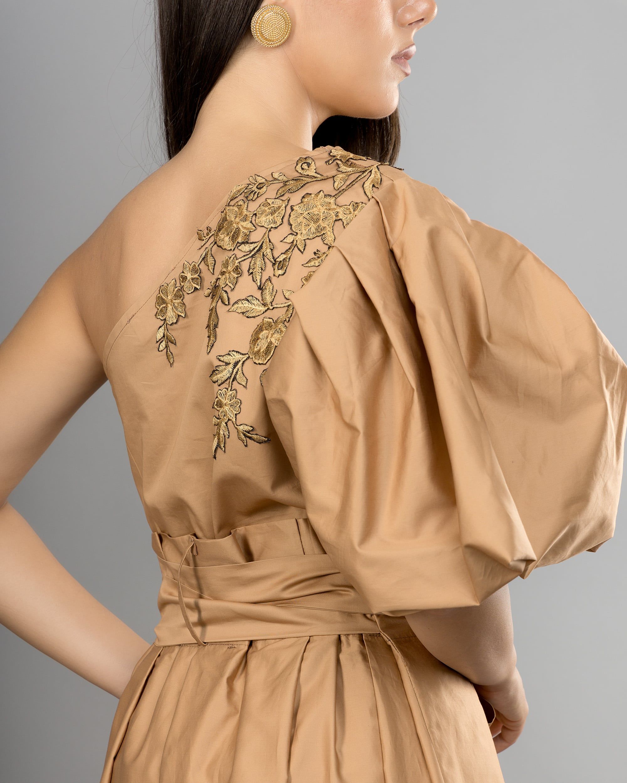Camel brown top with one shoulder and a puffed sleeve, adorned with handmade lace. Made from premium cotton fabric, skin-friendly and suitable for various occasions, perfect for the fall season.