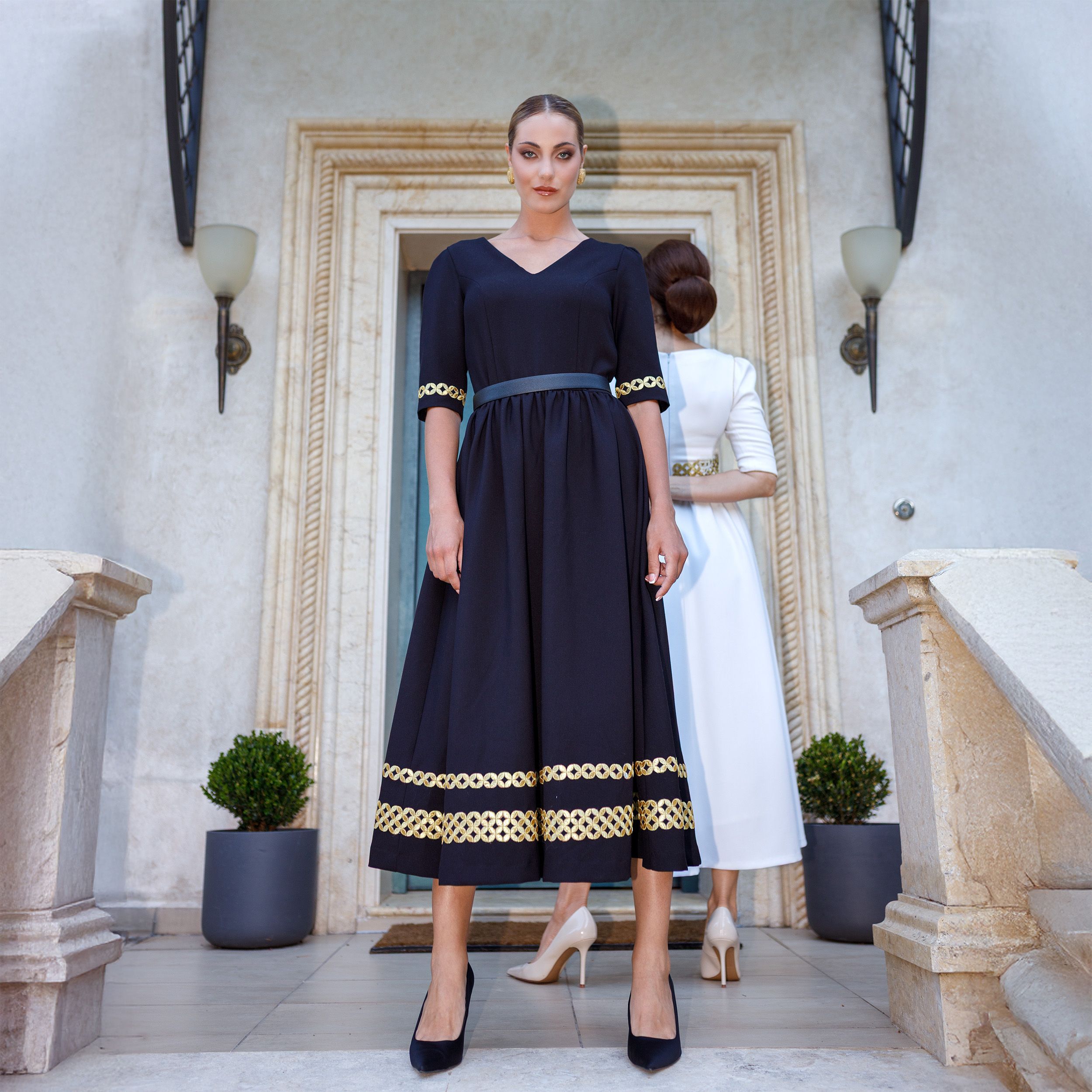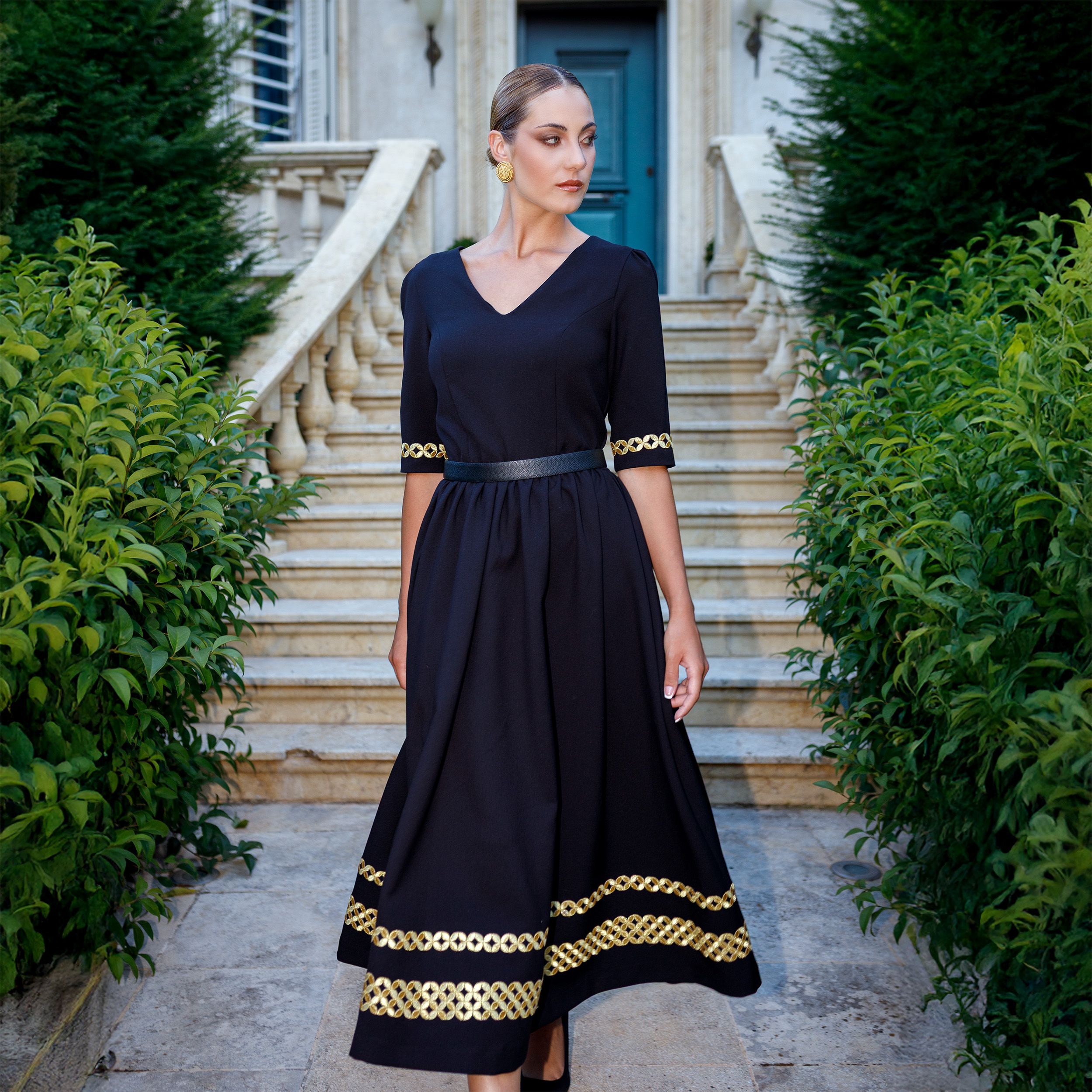 Crafted with meticulous attention to detail, the Grecian-inspired silhouette of this dress drapes elegantly, creating a fluid and statuesque profile. The rich black fabric serves as a canvas for intricate golden accents strategically placed to enhance the dress’s divine appeal. Following, the thoughtful integration of gold adds a touch of opulence, elevating the dress to a realm of unparalleled sophistication.