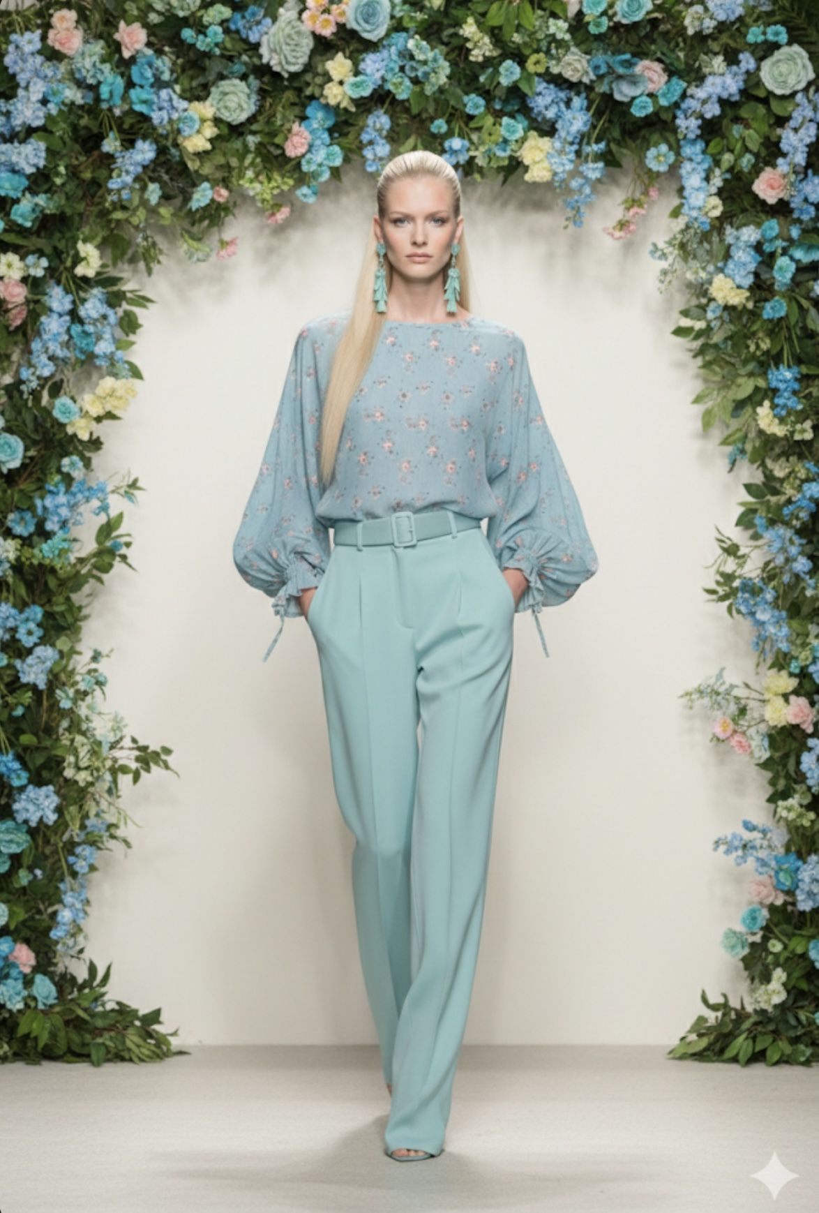 Due to the volume of the sleeves, it pairs perfectly with more minimal pieces on the bottom, such as the cigarette-cut trousers shown in the photo, helping maintain balance in the silhouette.