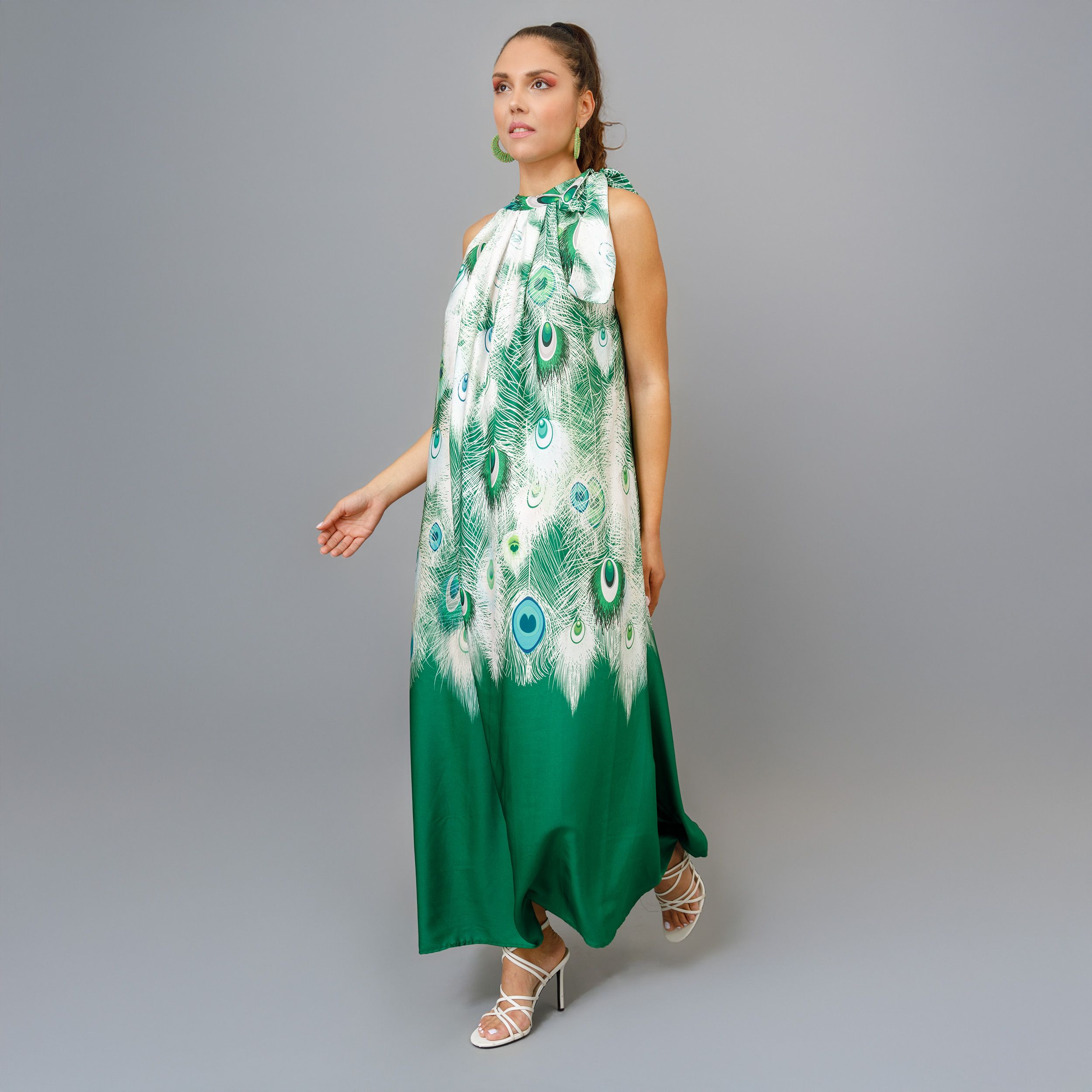 This long green sleeveless dress features a stunning peacock feather print, creating a vibrant and eye-catching design. The dress elegantly ties at the neck, adding a touch of sophistication and allowing for adjustable fit. Made from a soft, luxurious fabric, it drapes beautifully, ensuring both comfort and style.