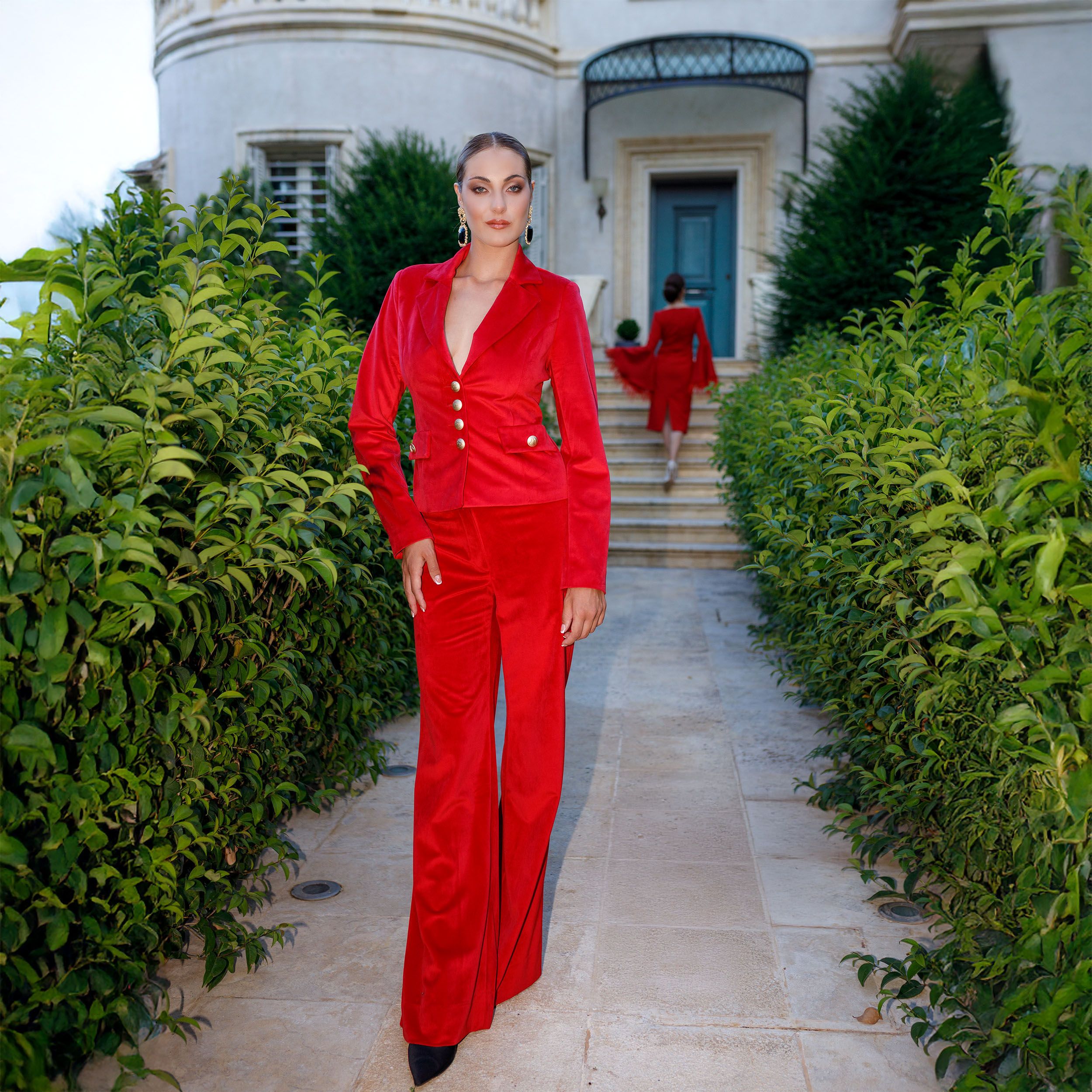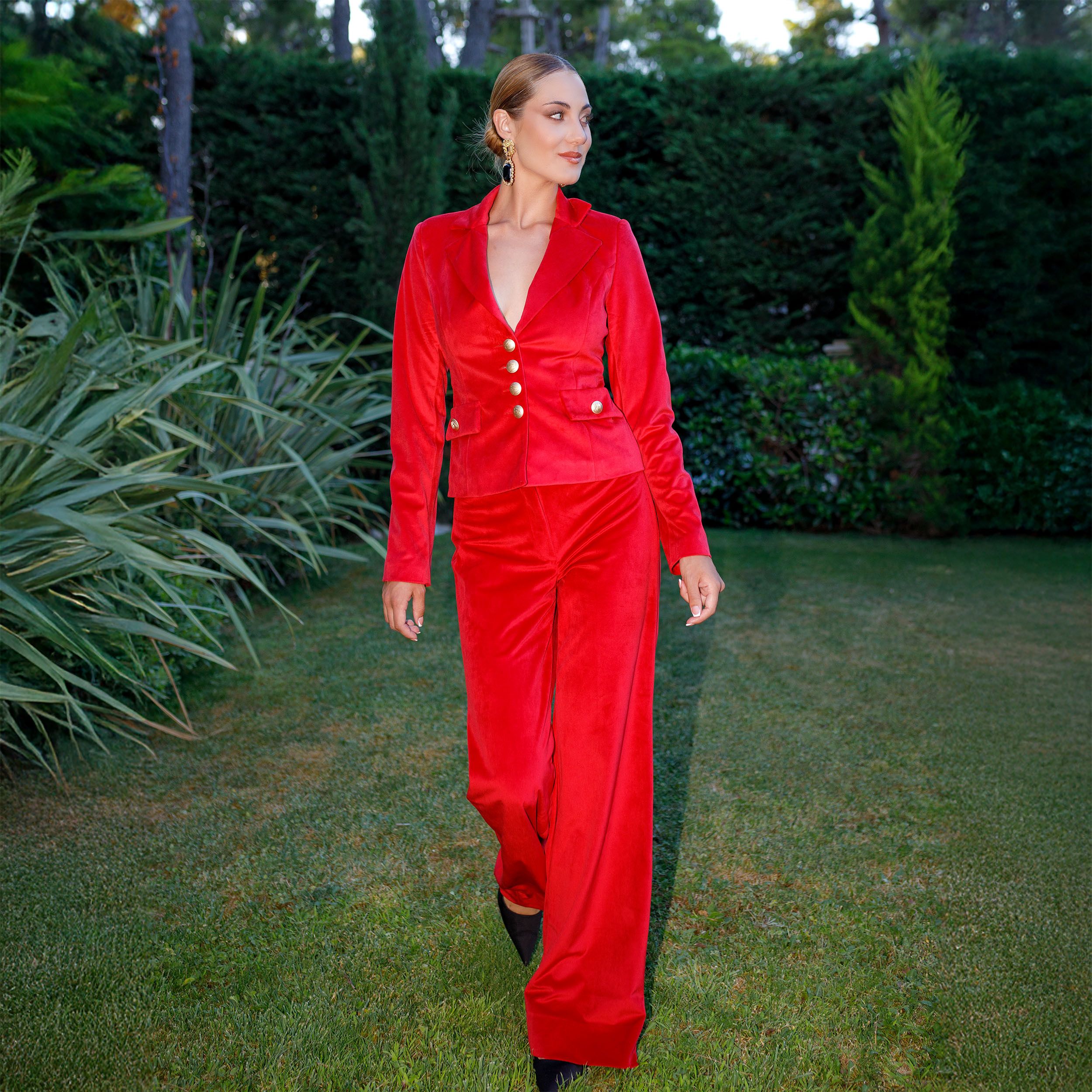 Elevate your wardrobe with these timeless red velvet trousers — a luxurious take on a classic silhouette. Crafted from plush, rich velvet in a bold crimson hue, they offer a tailored fit that flatters with effortless grace. The high-rise waist and straight-leg cut create a sleek, elongated line, while subtle detailing keeps the look polished and refined. Pair them with a crisp blouse for modern sophistication or style them with the matching blazer for head-turning impact. Glamorous, bold, and endlessly versatile — these trousers are made to move with confidence.